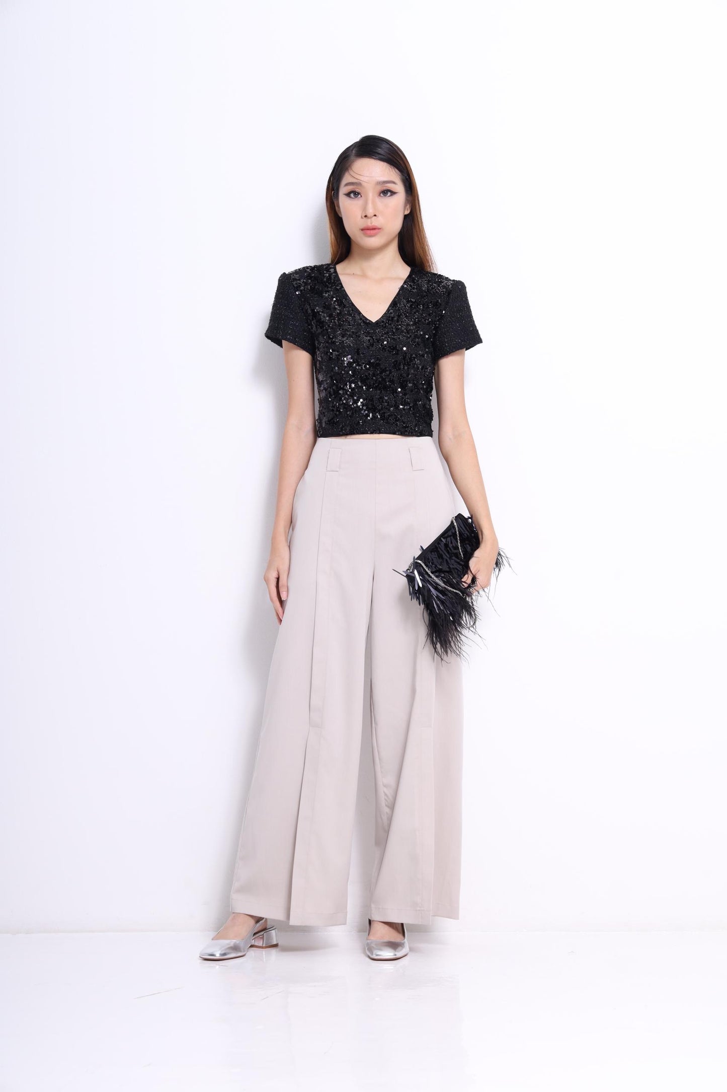 Be the center of attention with our Amelia Sequin V-neck Top! This striking tweed top features a sparkling all-over sequin design, guaranteed to make you shine in the crowd. Its boxy silhouette adds a touch of effortless style. Don't be afraid to stand out and make a statement!