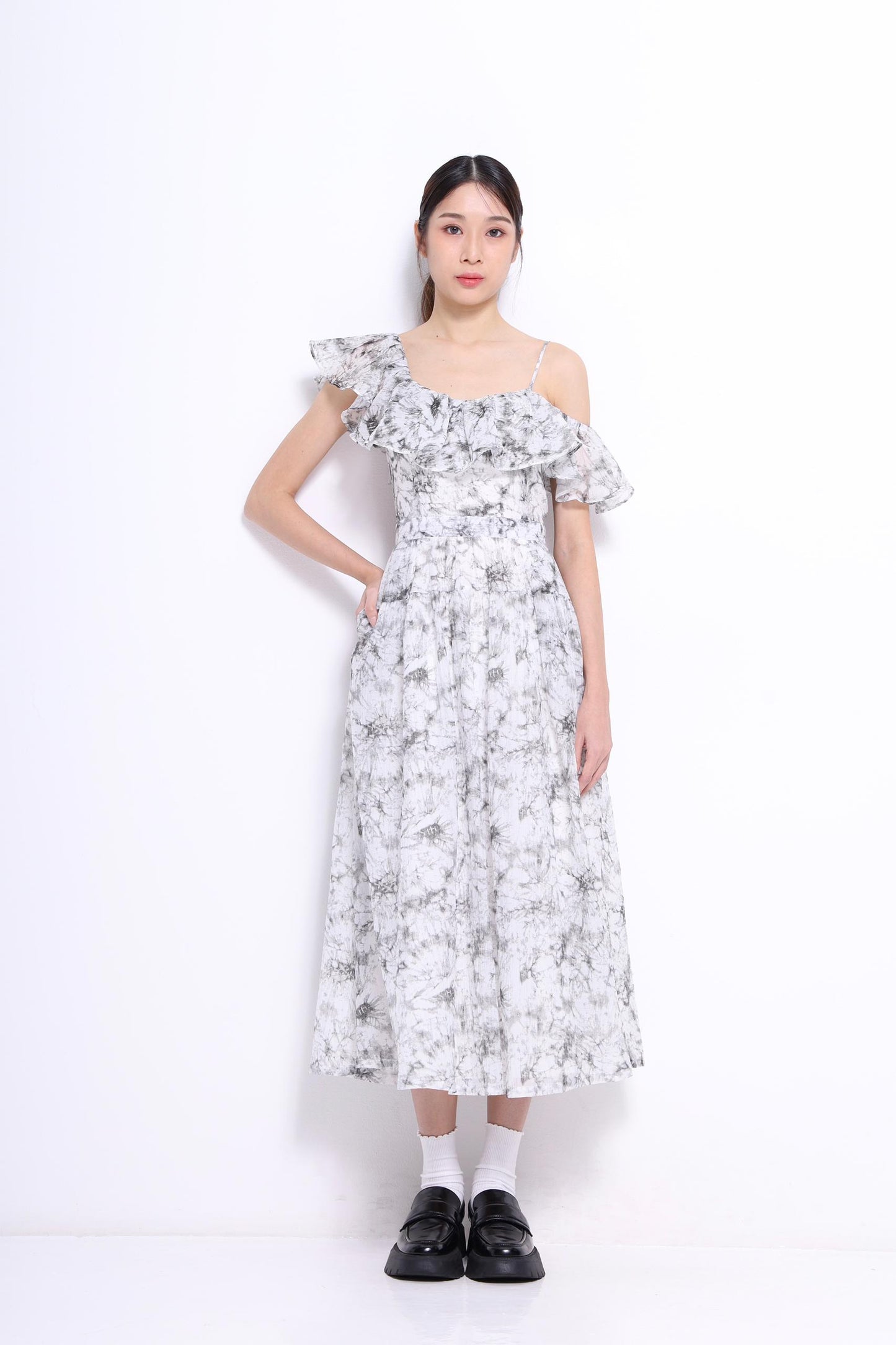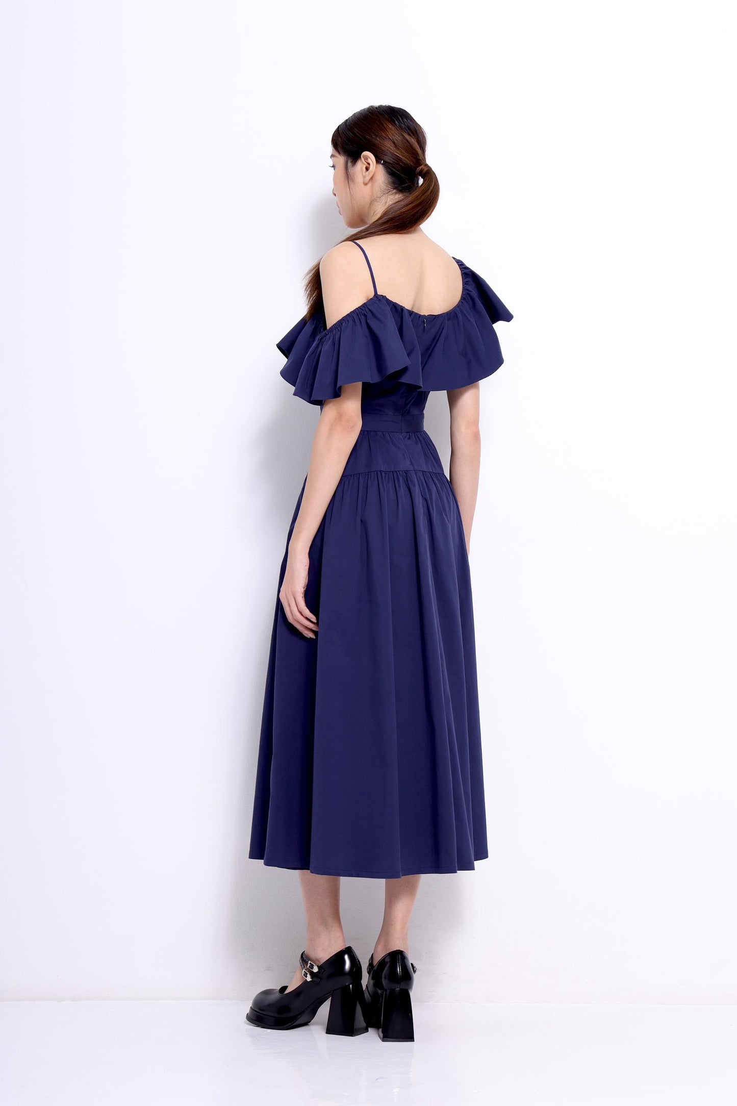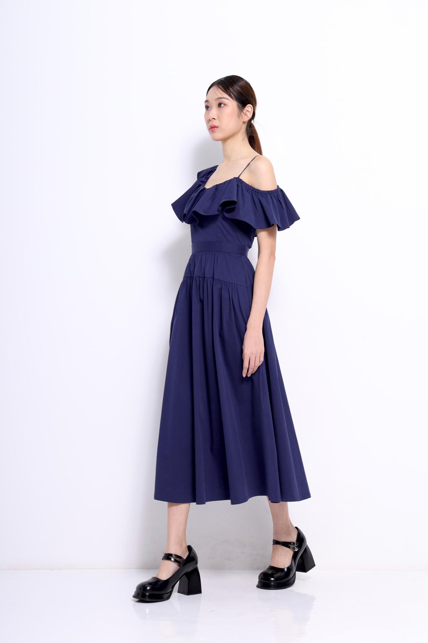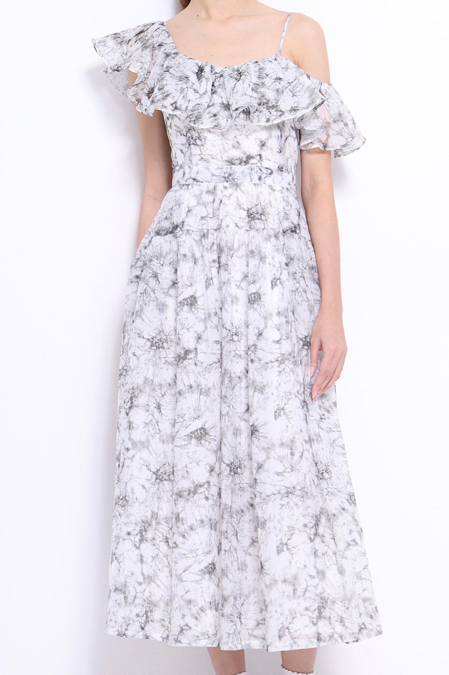 Elevate your style with the stunning Darla Off Shoulder Ruffle Dress. Featuring voluminous ruffle shoulder details and an asymmetrical silhouette with a delicate spaghetti strap, this gown highlights your figure with a cinched waist and maxi length. The A-line flare skirt adds a touch of romance to this perfect wedding guest outfit while functional side pockets add convenience. Experience the ultimate luxury with this exclusive dress.