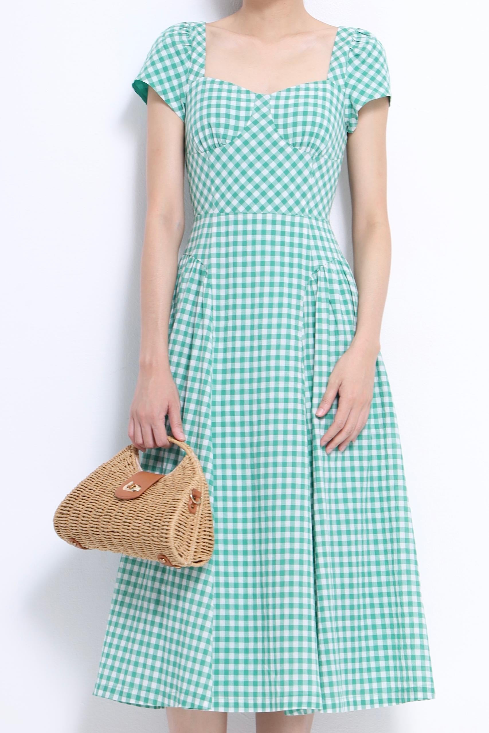 This checkered dress features a charming sweetheart neckline and a convenient back zipper closure. Designed with a vintage-inspired whimsical flair, it includes two side pockets for added functionality.