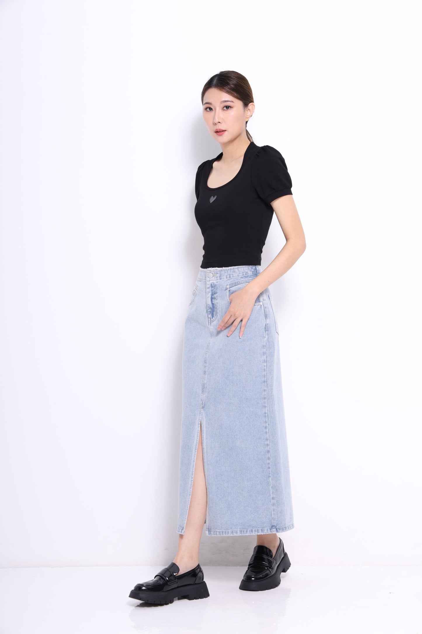 Our goal is to elongate your legs with a column silhouette and midaxi length, completed by a front slit. This skirt features a high rise fit that cinches your waist and a functional patch pocket for added convenience. It also has a front button closure and frayed waistband detailing for a touch of vintage charm.