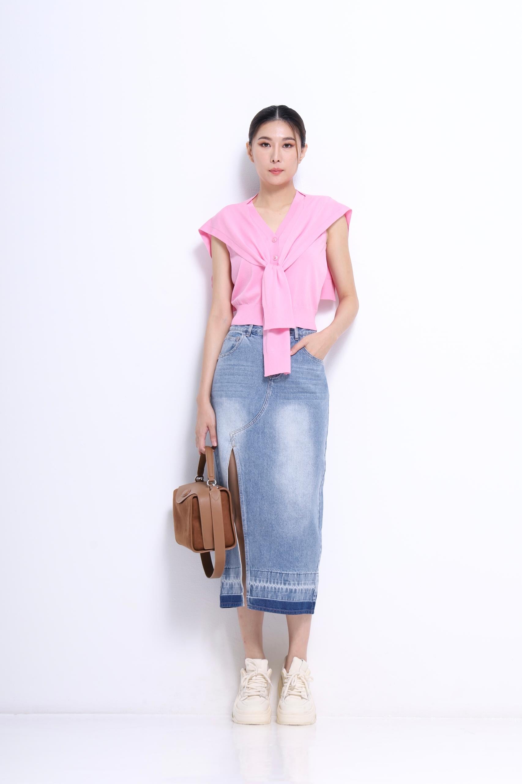 This playful 2-in-1 knit top combines a chic V-neck vest with a stylish faux cardigan draped over the shoulder. It brings a posh vibe without any extra warmth, making it the perfect comfy and fashionable choice for effortless outings.