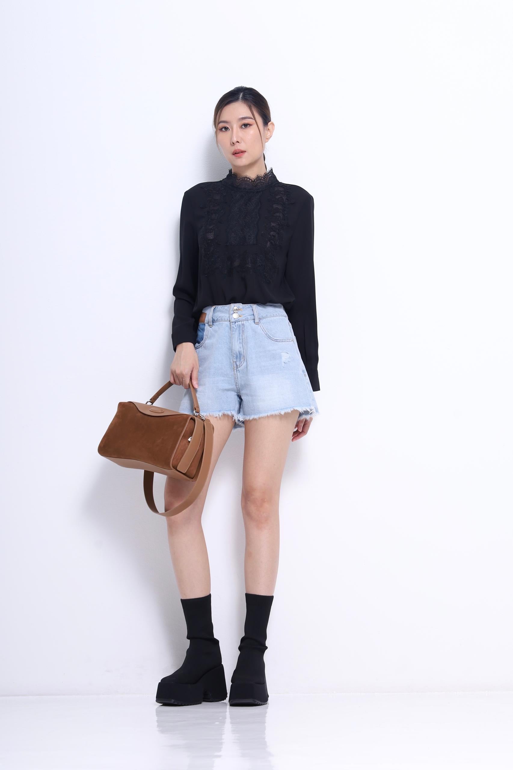 Elevate your style with the Lacey Mock Neck Lace Blouse, featuring a delicate lace lapel and a chic mock neckline. Perfect for switching up your look, wear it with wide-legged trousers for a polished, formal vibe or pair it with simple jean shorts for a playful, couture-cool twist. This blouse adds a touch of elegance and fun to any outfit!