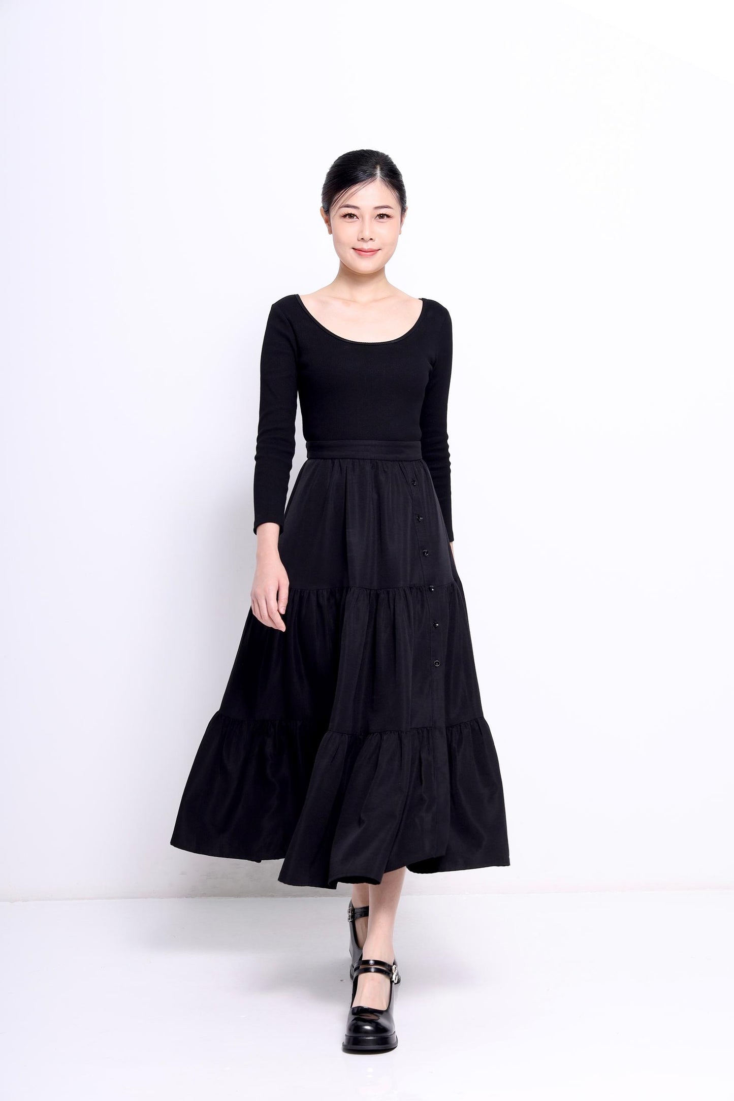 Indulge in the sophisticated elegance of Lia, a layered knitted dress that accentuates the collarbone with its deep round neck. The soft, knitted bodice flows into a voluminous skirt, perfect for twirling. Adjust the side slit with the delicate side buttons for a custom fit.