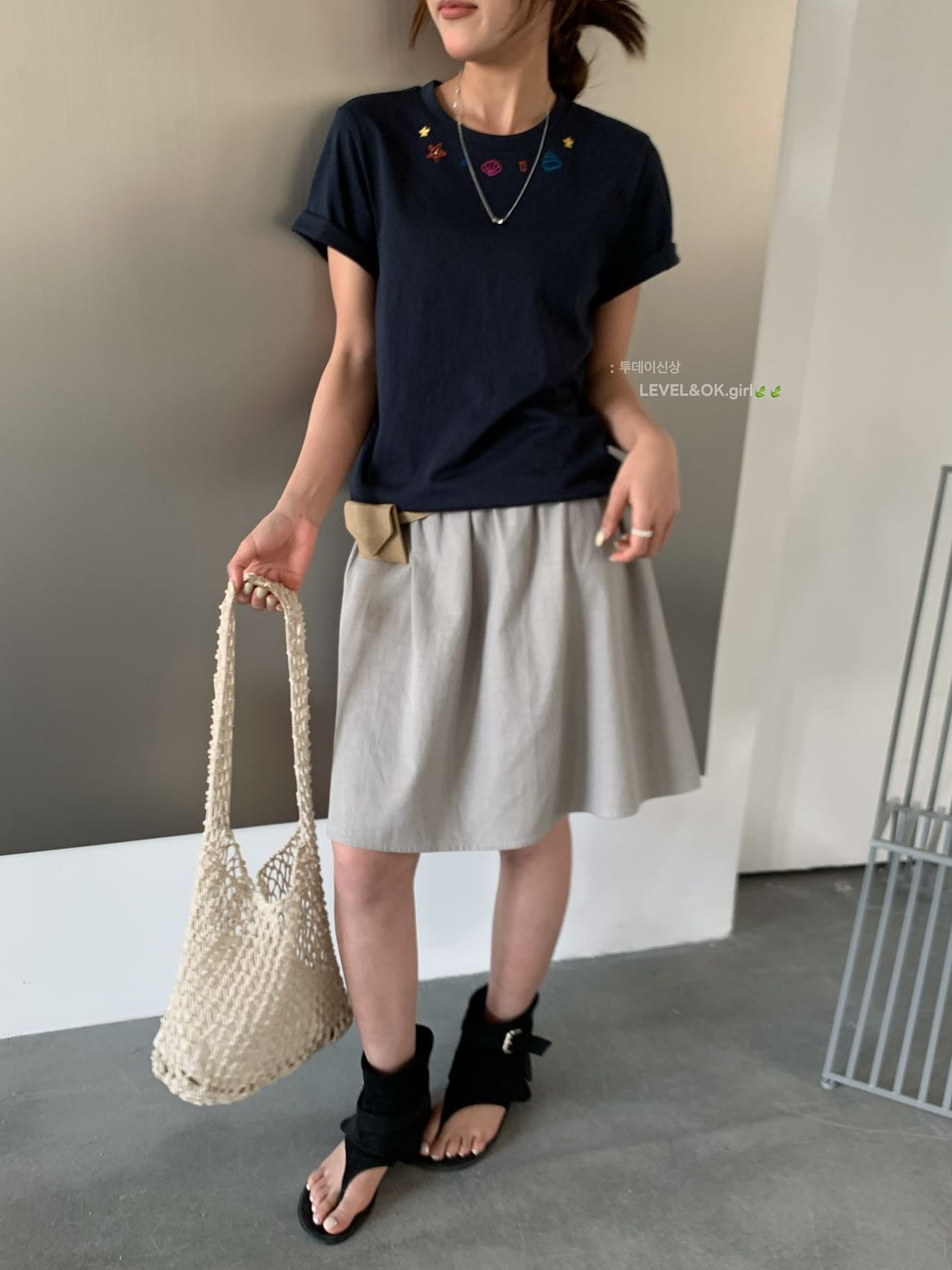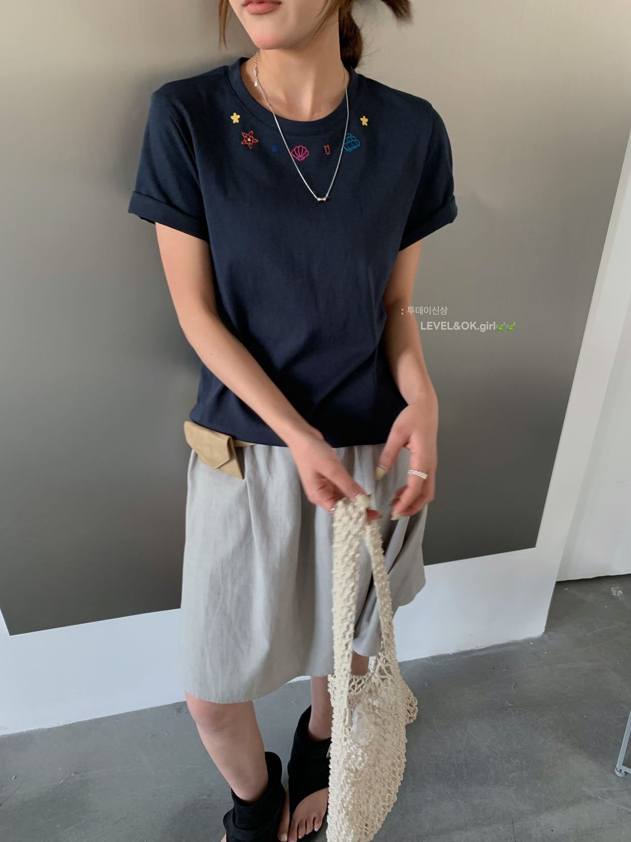 Embrace effortless style with this Seashells Starfish Embroidered Tee, crafted from wrinkled cotton that's airy and breezy—ideal for warm summer days. The iron-free fabric means minimal fuss while maintaining that relaxed, textured aesthetic. Delicate seashells and starfish embroidery adorns the neckline, adding a charming coastal touch to your everyday wardrobe. Perfect for casual outings and laid-back adventures.