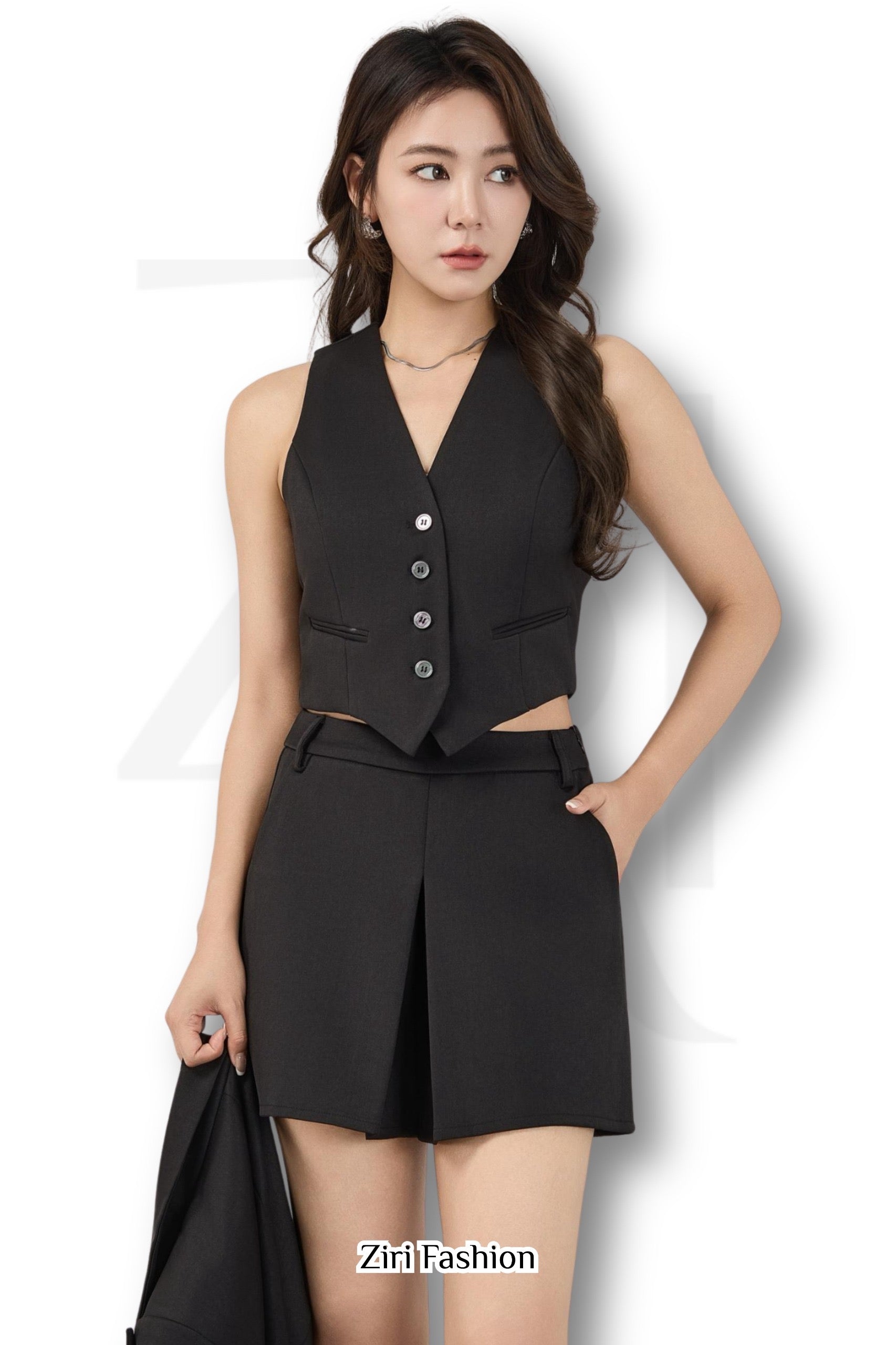 Elevate your wardrobe with the Ziri V-Neck Cropped Vest, designed to maintain its form throughout the day. Featuring a refined tailored fit and an elegant V-neck button-down style, it effortlessly blends sophistication with comfort for any event. This vest is part of a 3-piece ensemble, paired beautifully with the Ziri Blazer Jacket and Ziri Pleated Skorts.